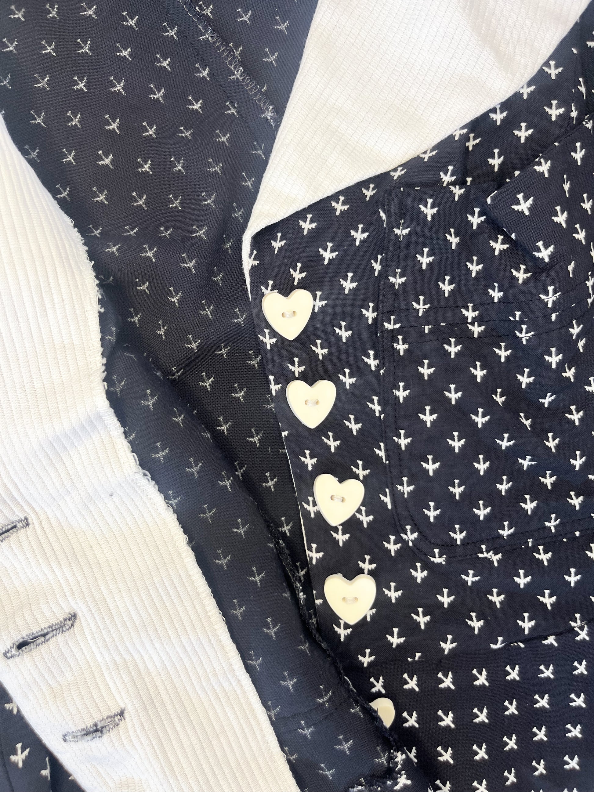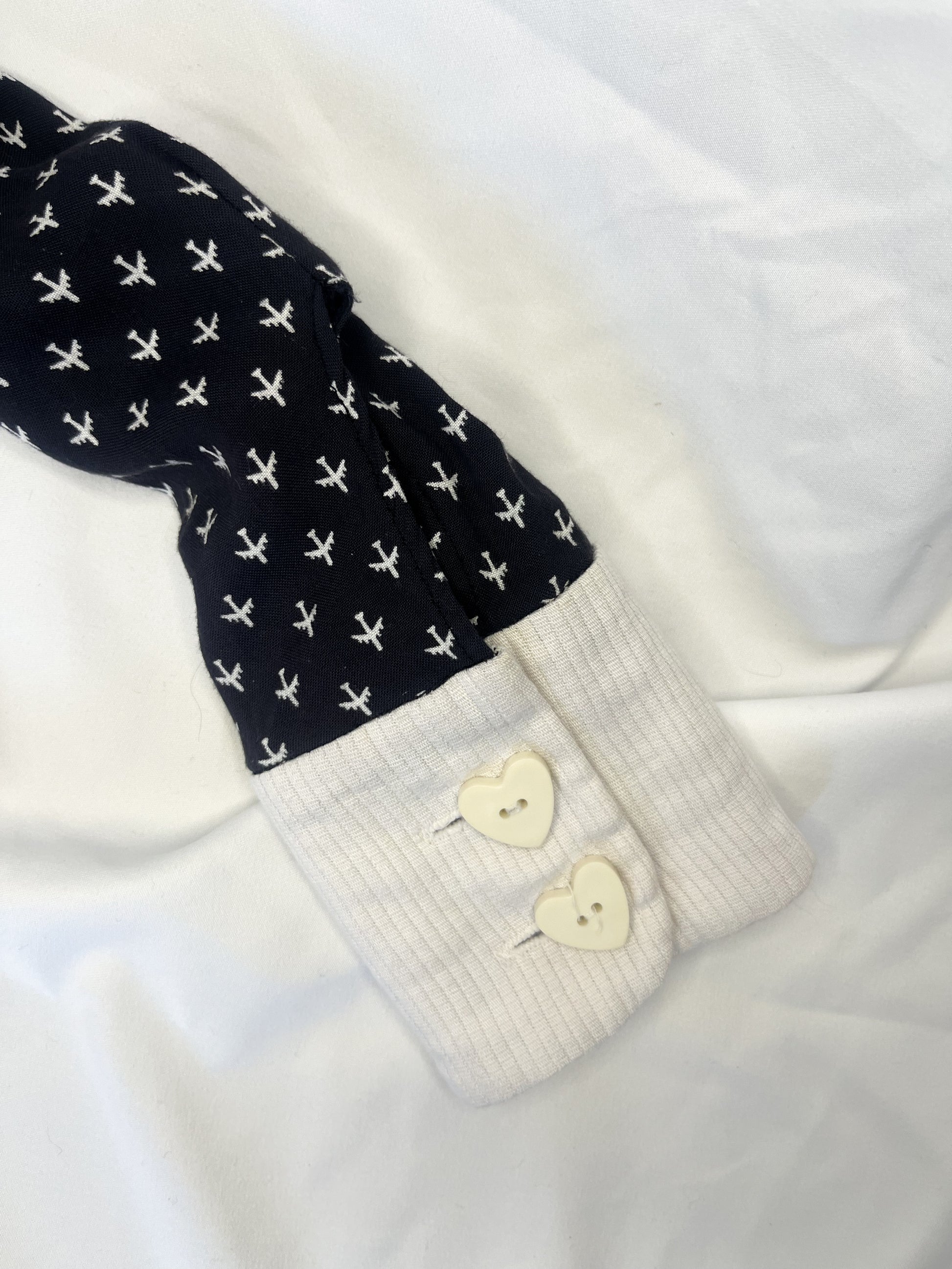 This beautiful navy and white airplane print top by Biba was once owned by the gorgeous 1960s/70s model Vivian Neves. We acquired this stunning piece from her wonderful niece, who stated that Vivian would have loved to have seen the piece re-worn and re-loved. Featuring corduroy material on the collar and sleeve cuffs and the cutest cream heart-shaped buttons, this top is a girly staple.