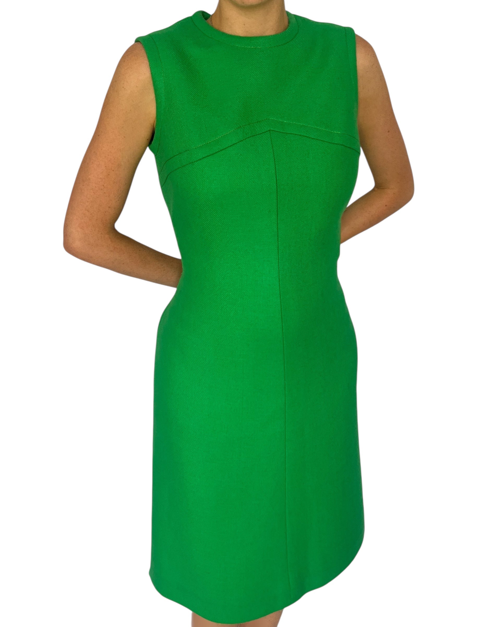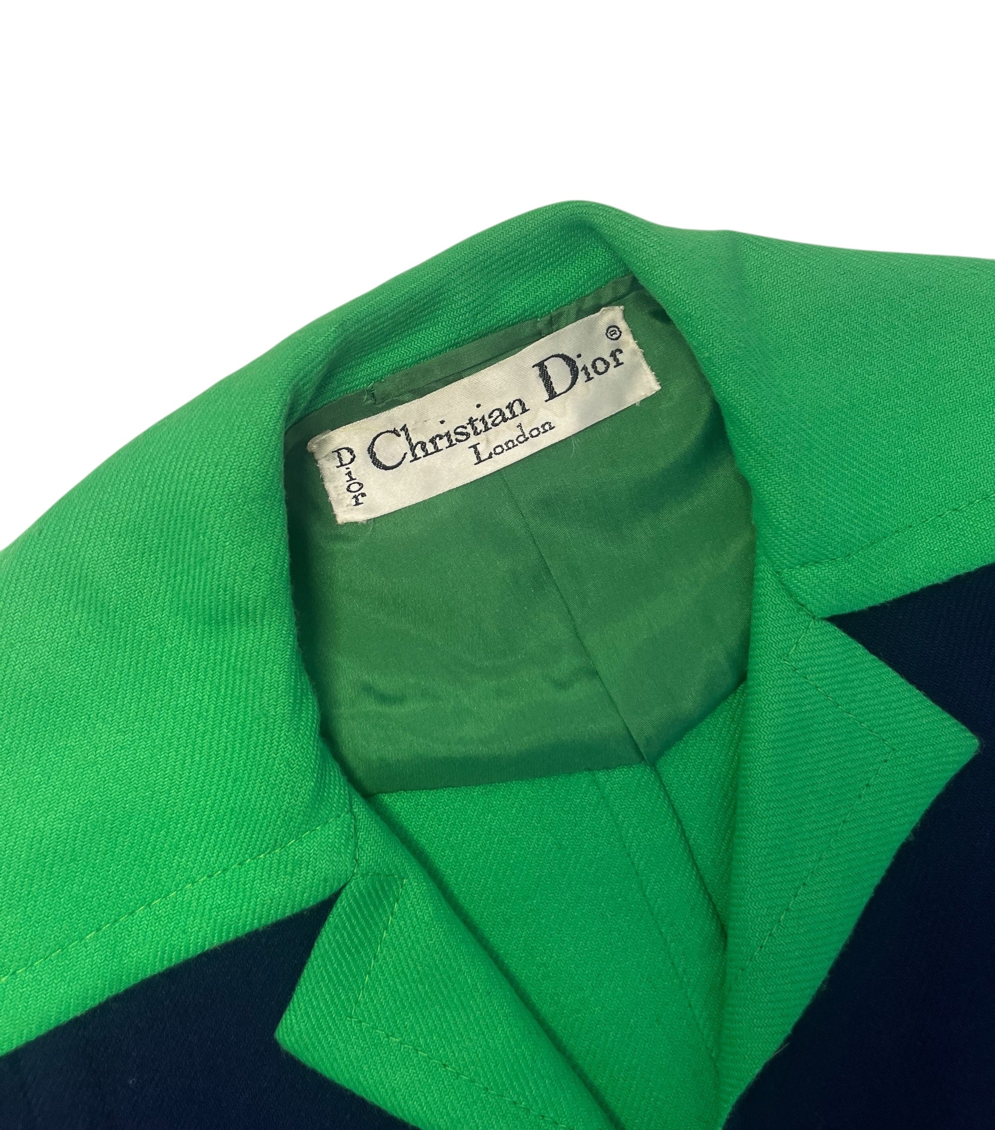 A circa. 1960s Christian Dior two-piece, consisting of a lime green frock dress reaching just below the knee and a matching navy blue short-sleeve jacket with lime green accents. Details including a matching belt and buttons.