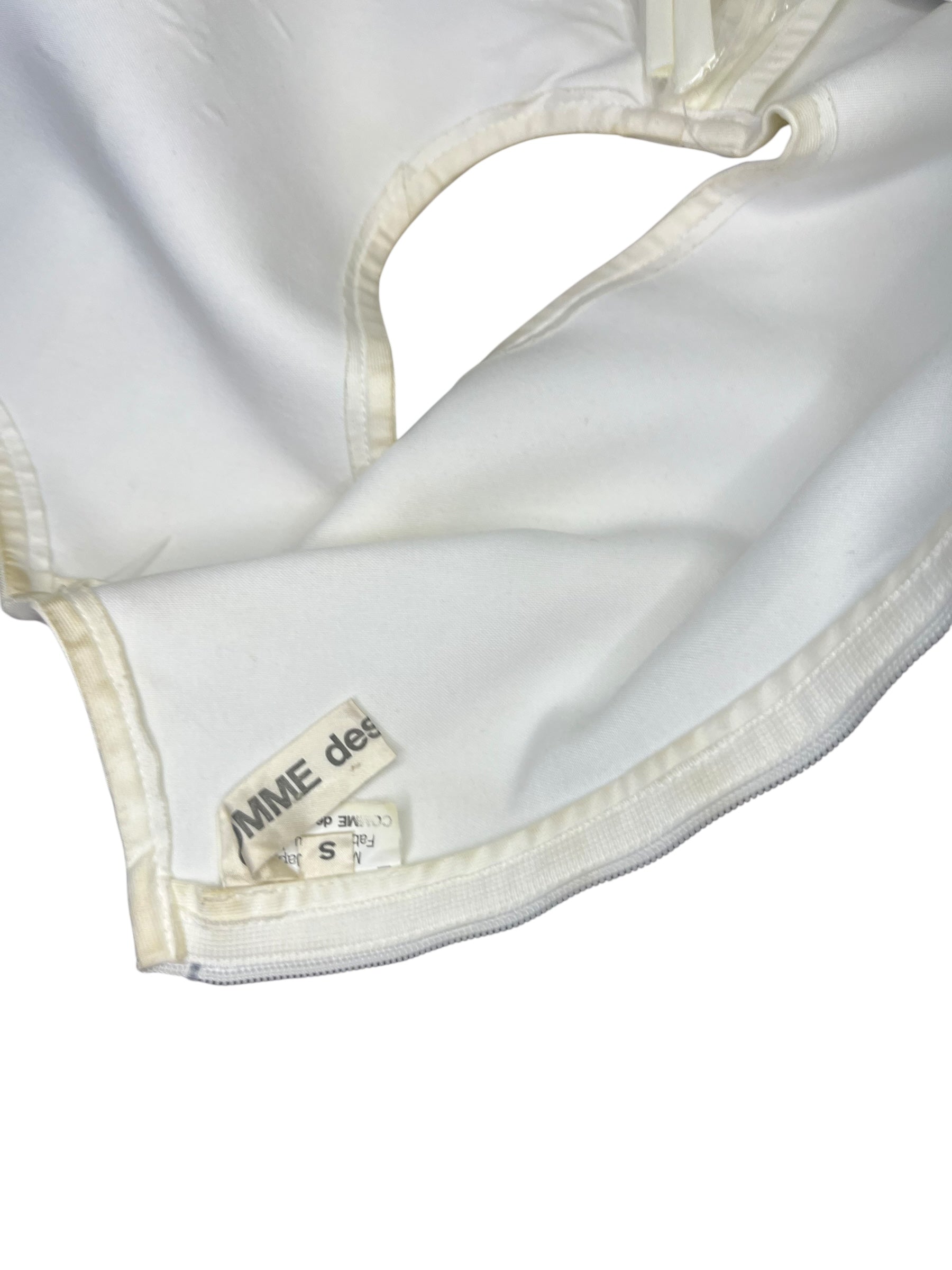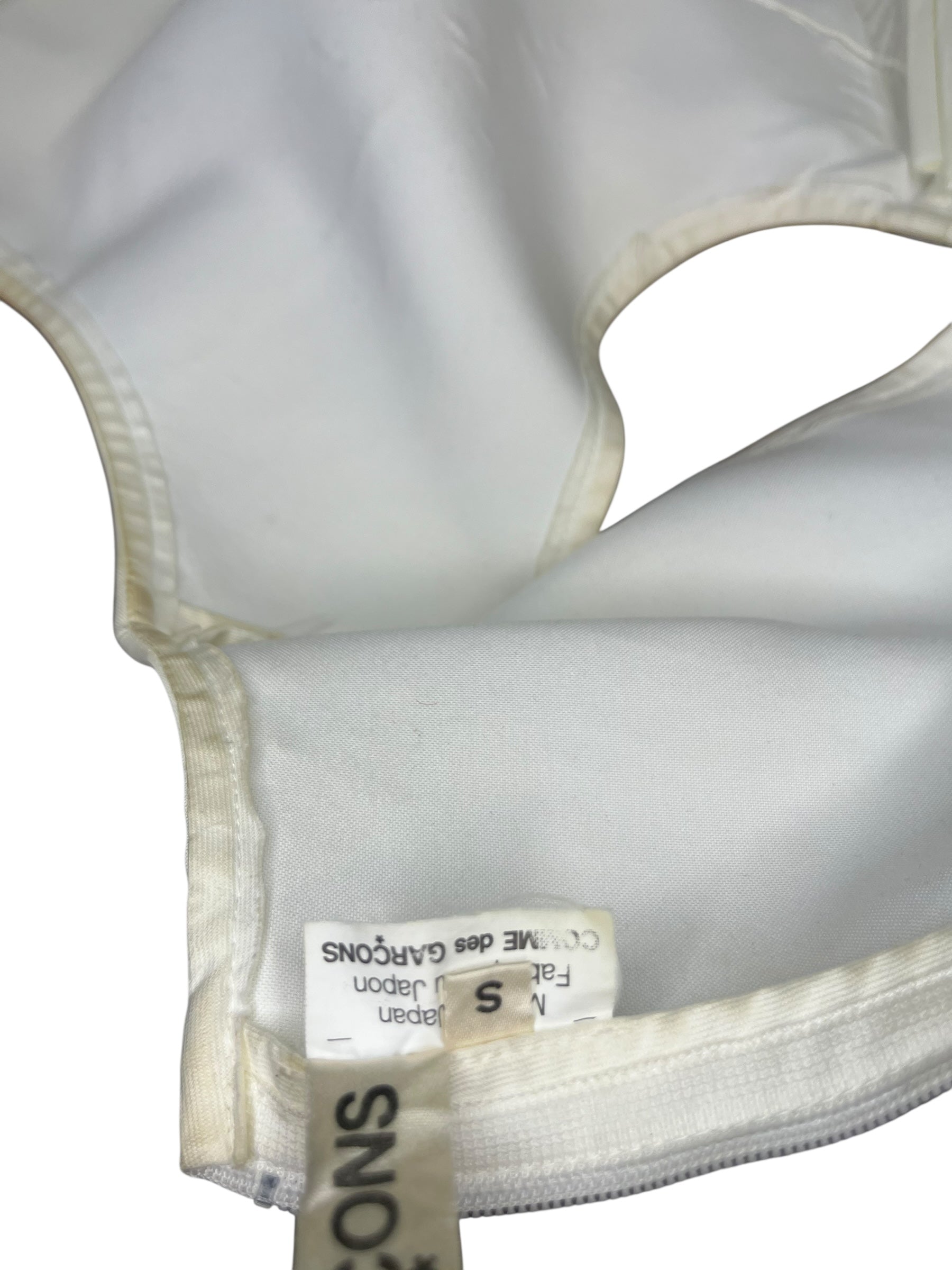 White silk taffeta midi dress for the Spring 2011 runway show. Featuring a wide belt with a silver metallic clasp around the waist and a zip-up back.