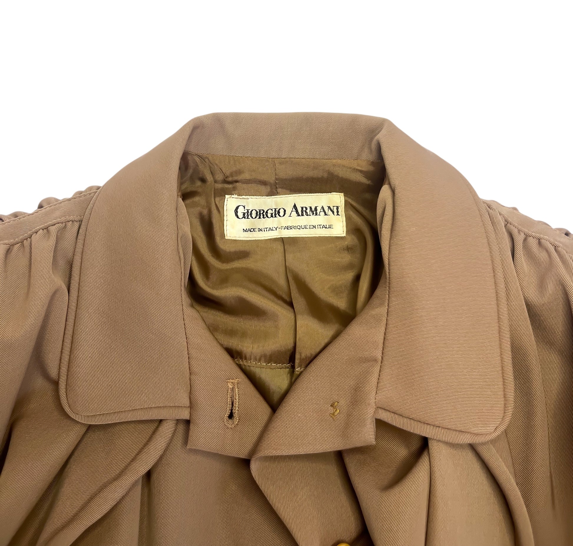 Stunning Giorgio Armani waistcoat and shirt layered top from the F/W 1989 Ready to Wear collection. Consisting of a waistcoat interior, with a layered shirt on top and slightly padded shoulders, this piece embodies the Golden Age of Armani. Buttons all the way down the waist coat, with the shirt component left open, together with a high collar. Cuffed wrists and pleating on the shoulder pads are the finishing details on this piece.