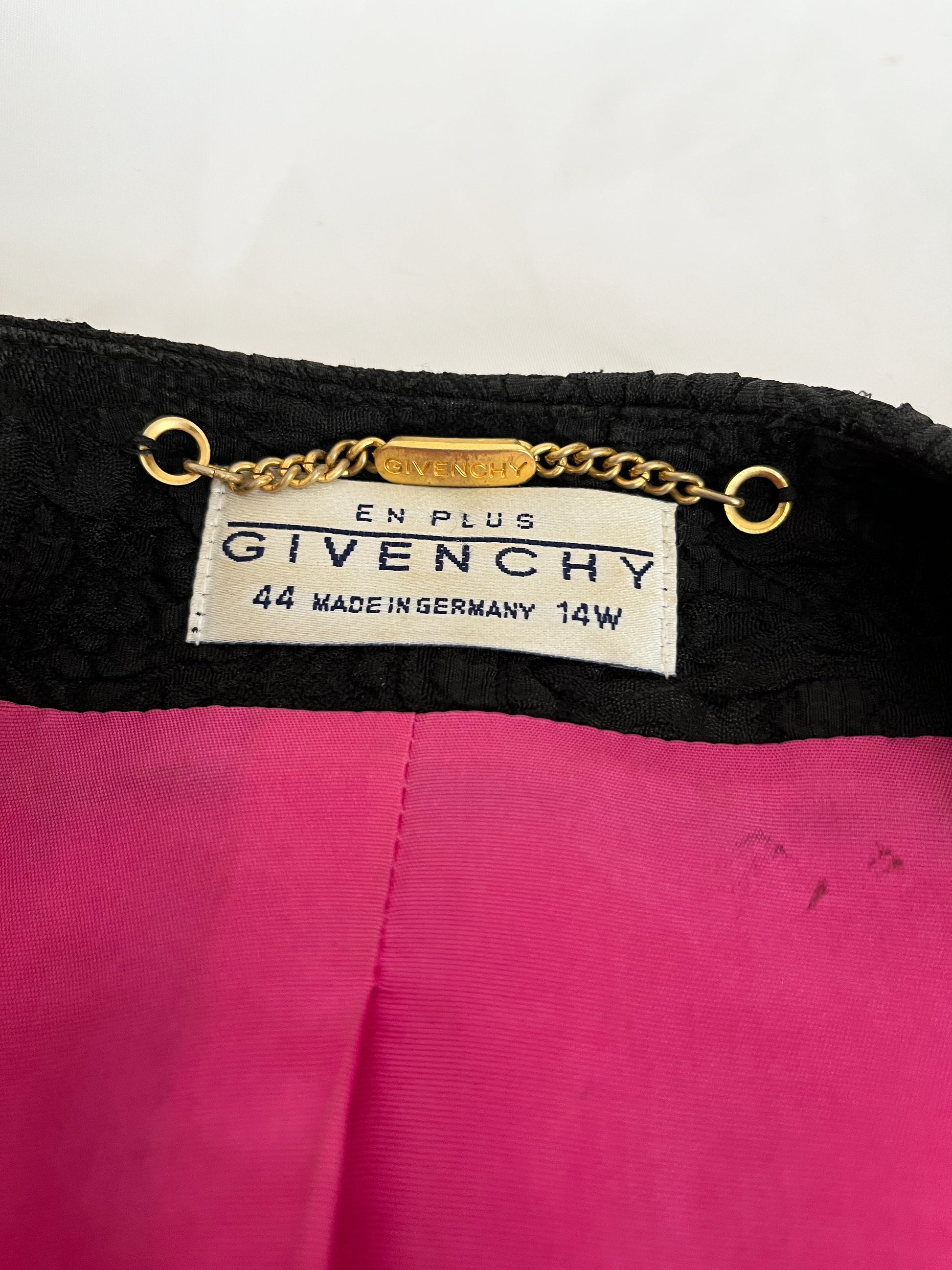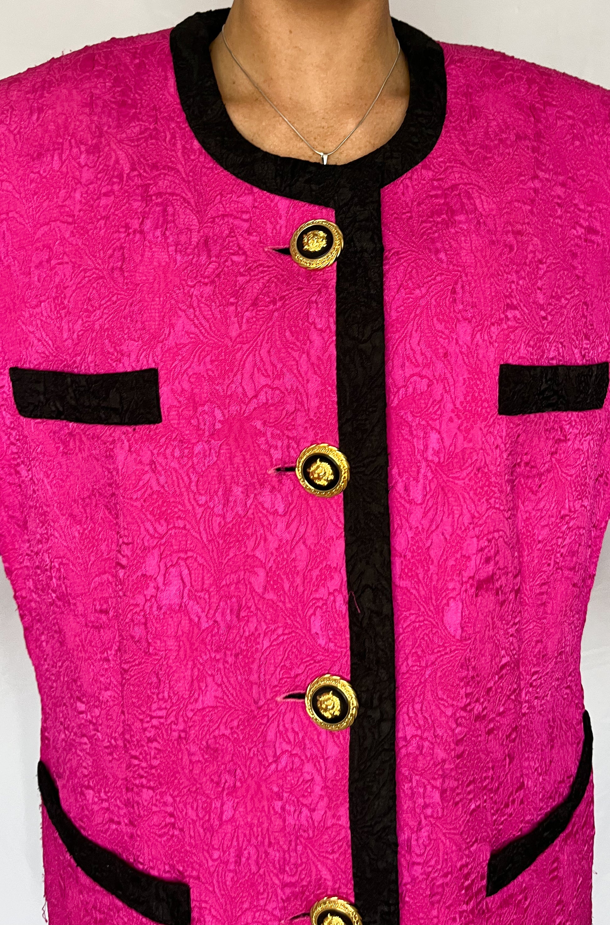 This bright and beautiful suit from the En Plus line by Givenchy is a fabulous testament to 1980s luxury. This piece has a floral design on a textured fabric both on the skirt and jacket. The jacket is a bright, block-colour fuchsia pink, complimented by a black trim along each hem and pocket. The finishing touches are the black and gold enamel buttons with a lion motif. C. 1988.