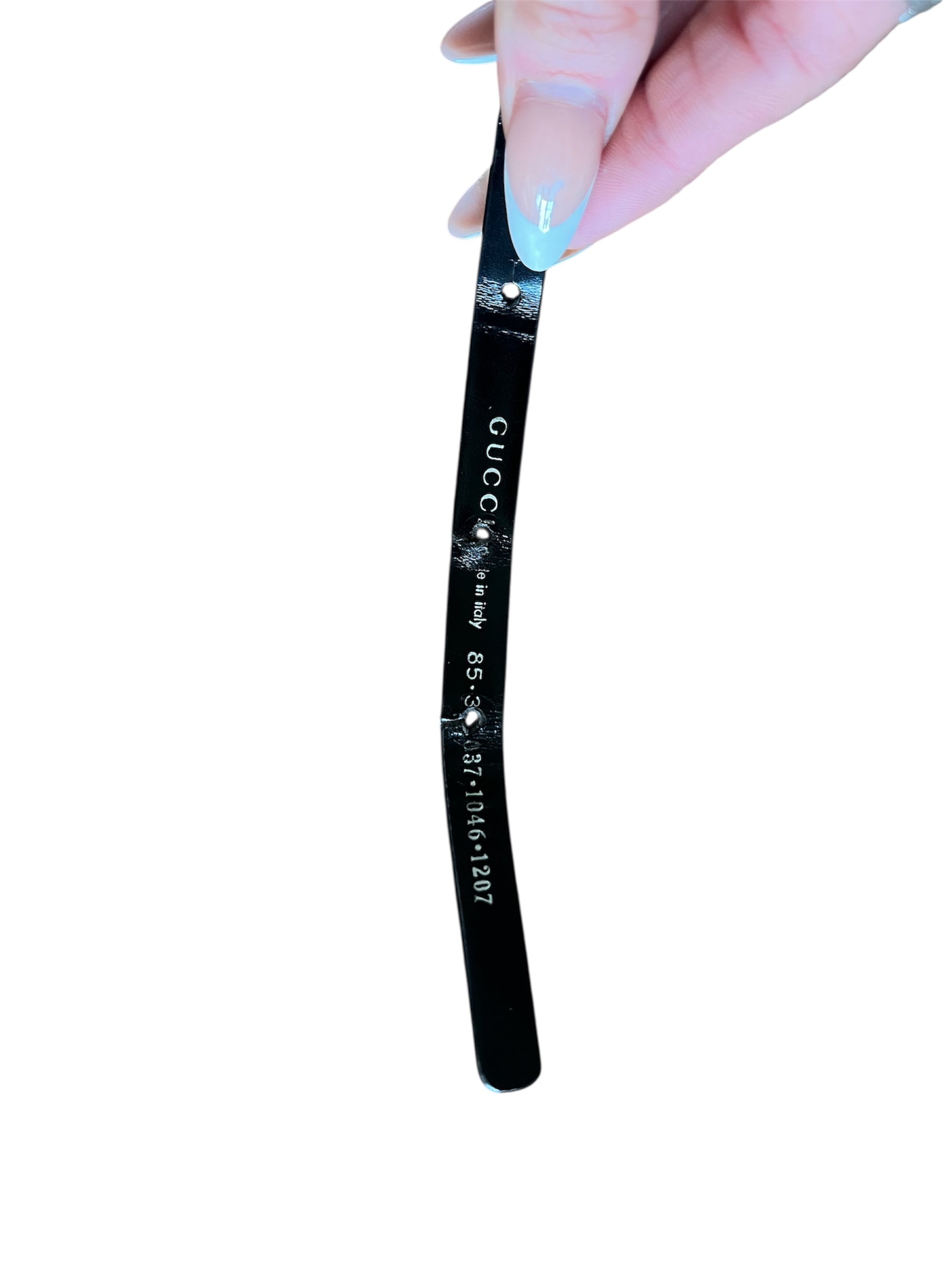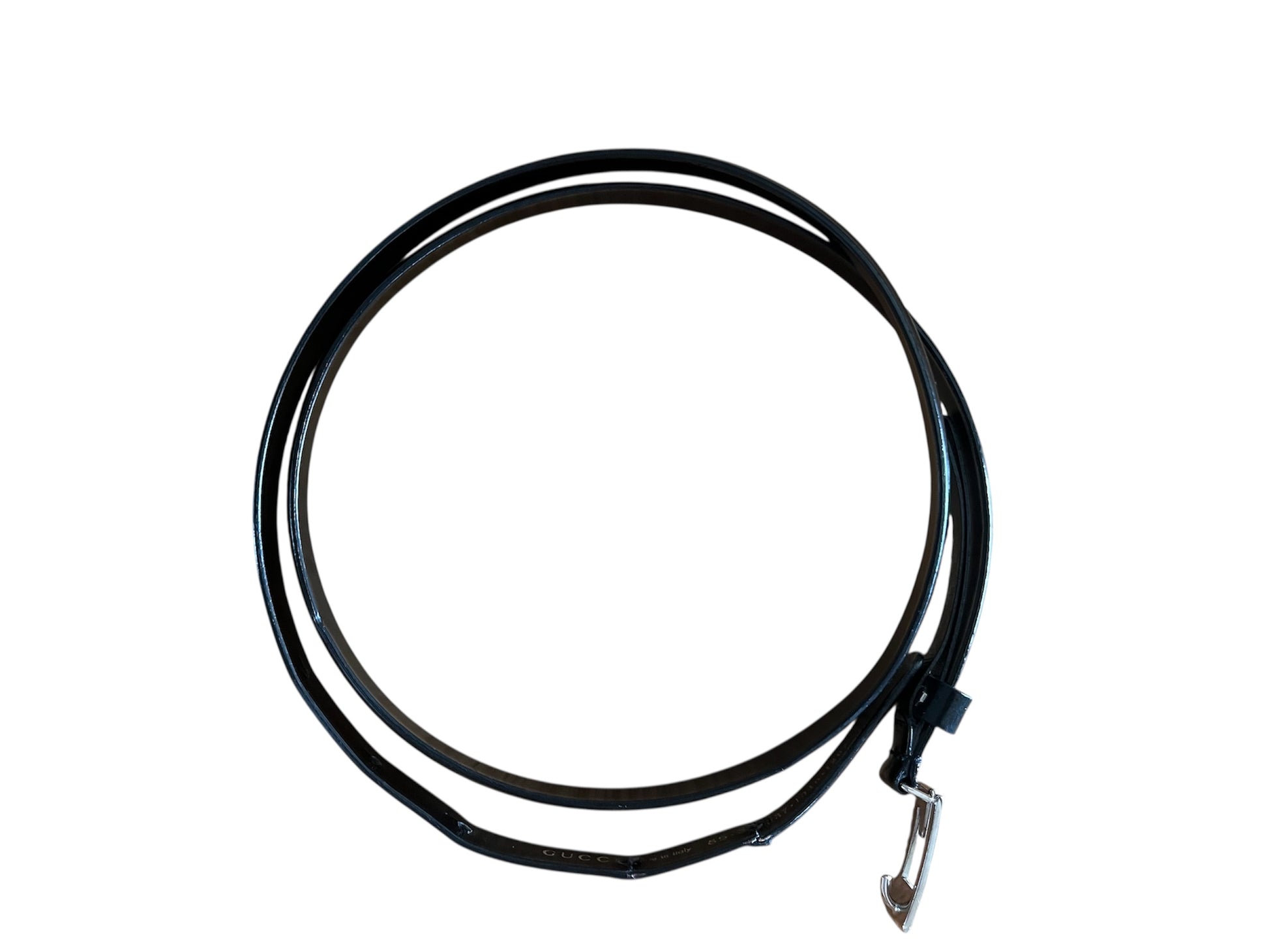 Gucci - Tom Ford era - a patent leather slim belt, featuring a silver-tone, geometric, G-shaped buckle fastening. C. 1998