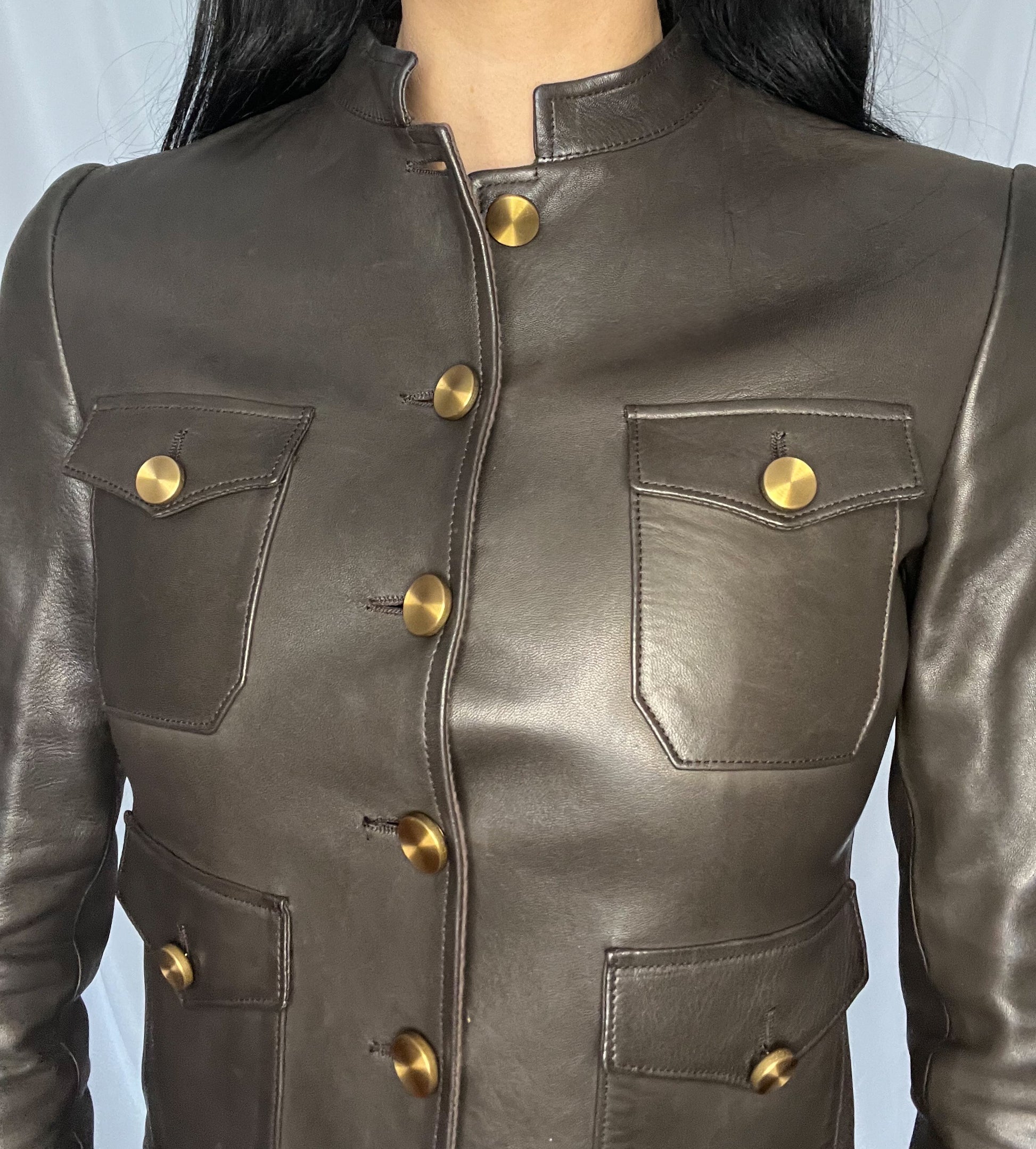 Dark brown leather jacket by Tom Ford for Gucci Spring/Summer 2002 collection. Featuring a stand collar and gold-tone button detailing, along with four front flap pockets.