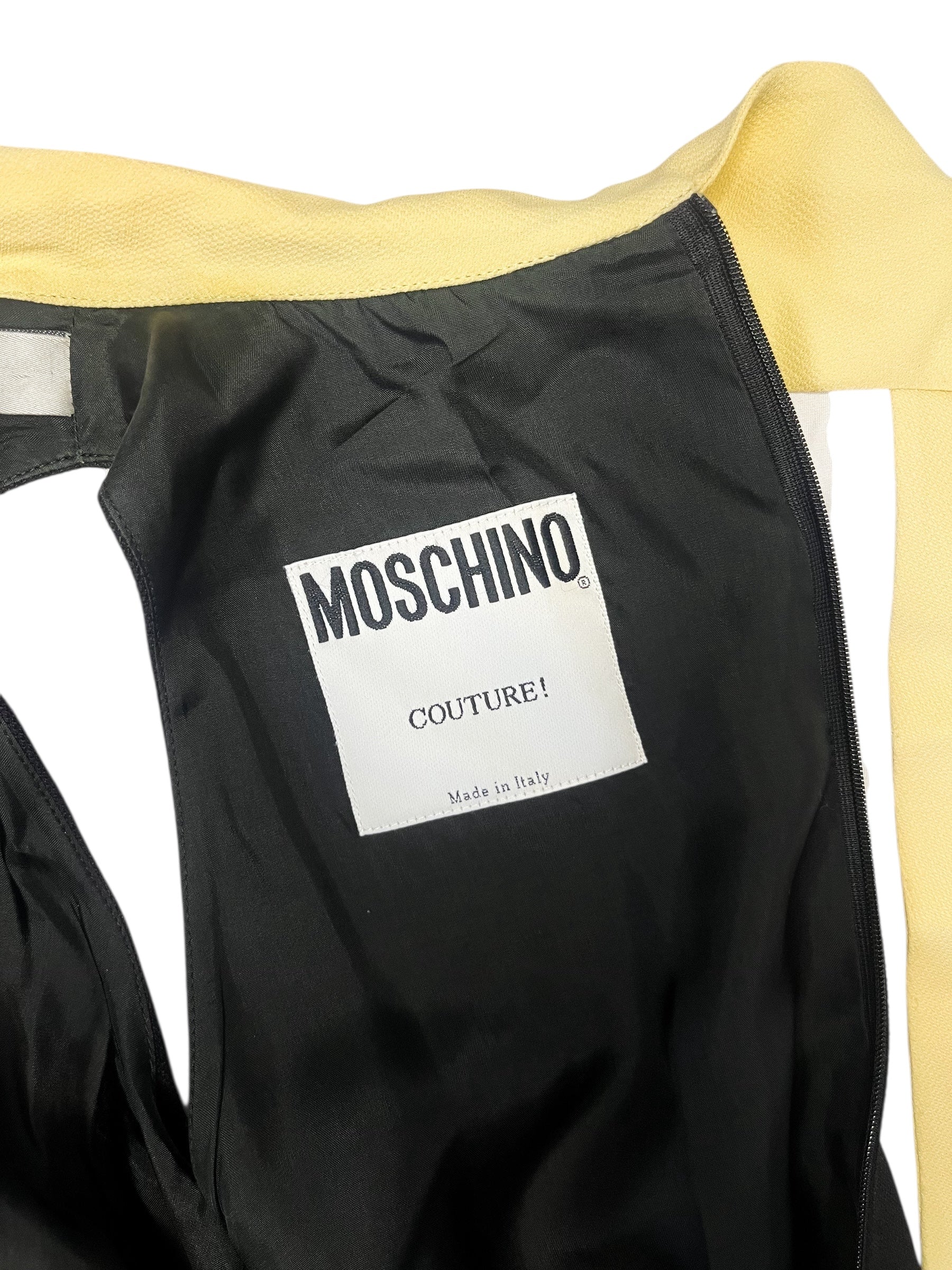 Beautiful and classy Moschino Couture! Shift dress in black, with a cream ribbon accent on the neckline. A feminine and chic staple piece. C. 1993.