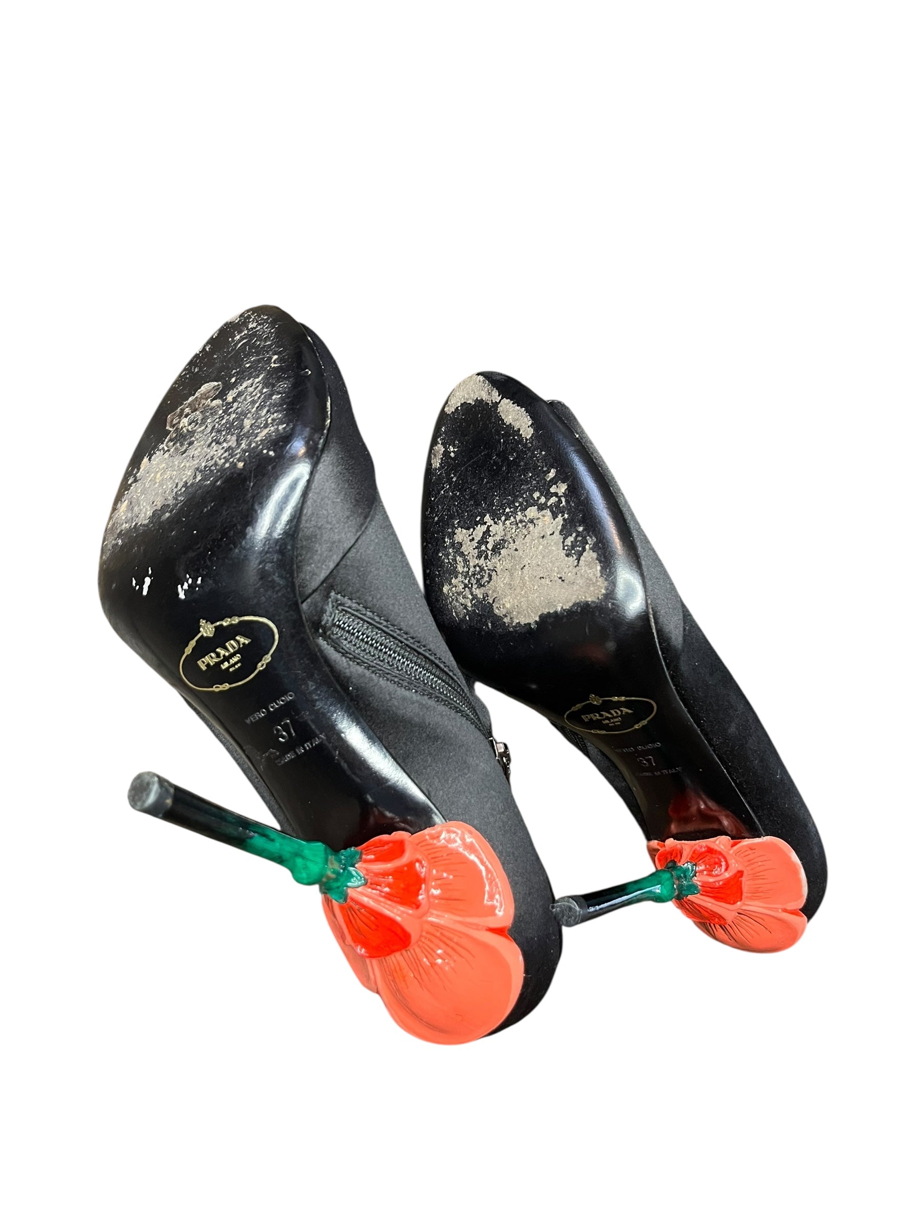 These beautifully unique Prada heels come from the ‘Fairy Collection’ by Miuccia Prada, Spring 2008. Aiming to go against the classic neutral Prada colour palette, this collection was inspired by the garden. Some oriental and art nouveau style designs and prints, with