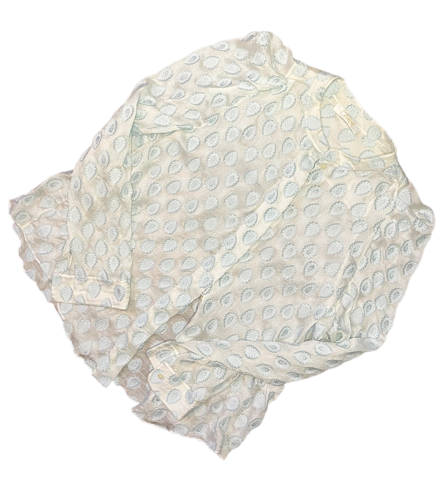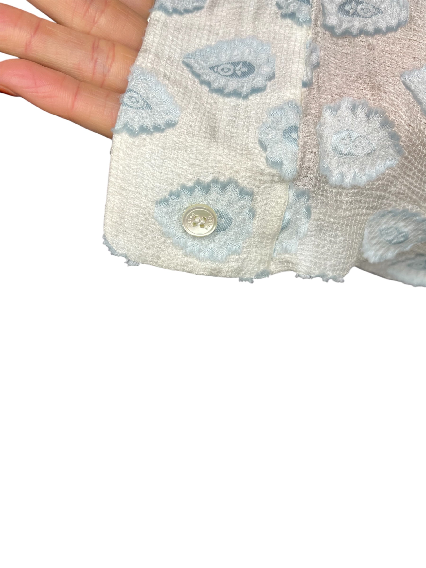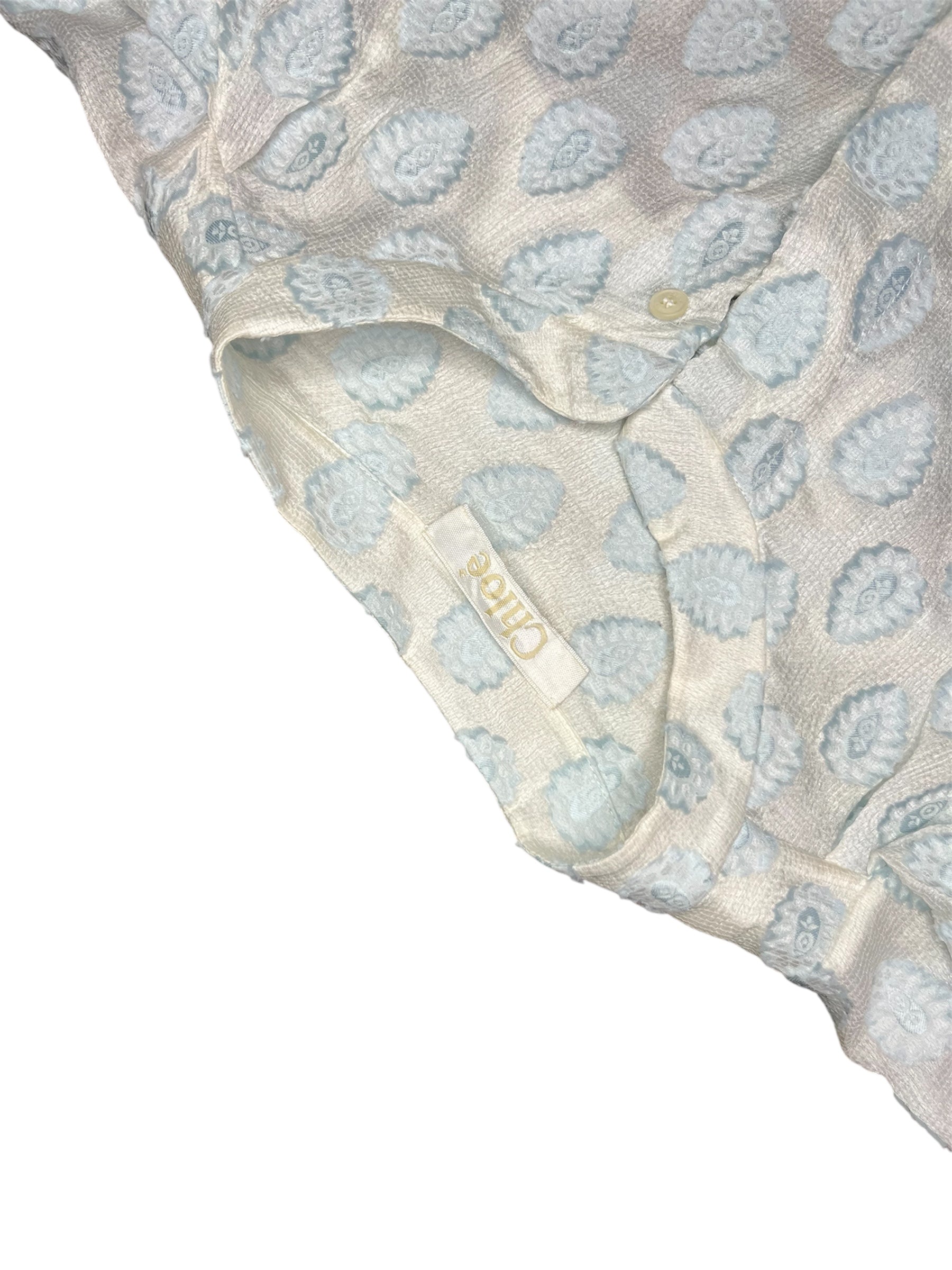 Beautiful cotton blouse by Chloe as seen on the runway in their SS2014 RTW show. In a pale ice blue shade and paisley detailing in fb fabric, this piece is elegant and feminine. In perfect condition.